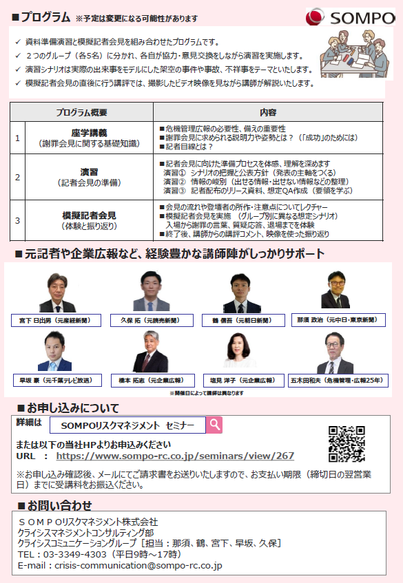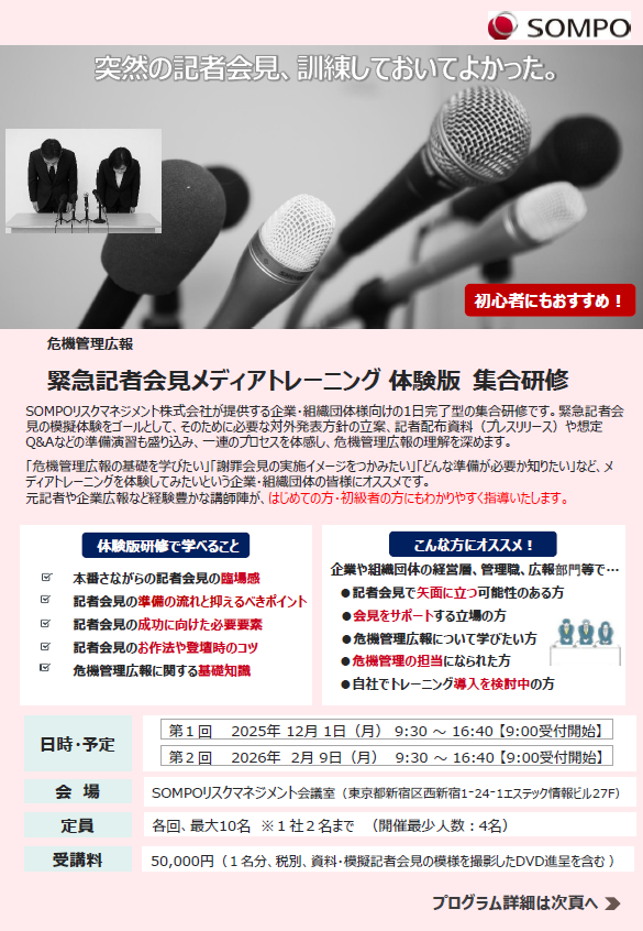 「損保ジャパン社」のグループ会社である「SOMPOリスクマネジメント社」において『緊急記者会見メディアトレーニングセミナー』が開催されます。